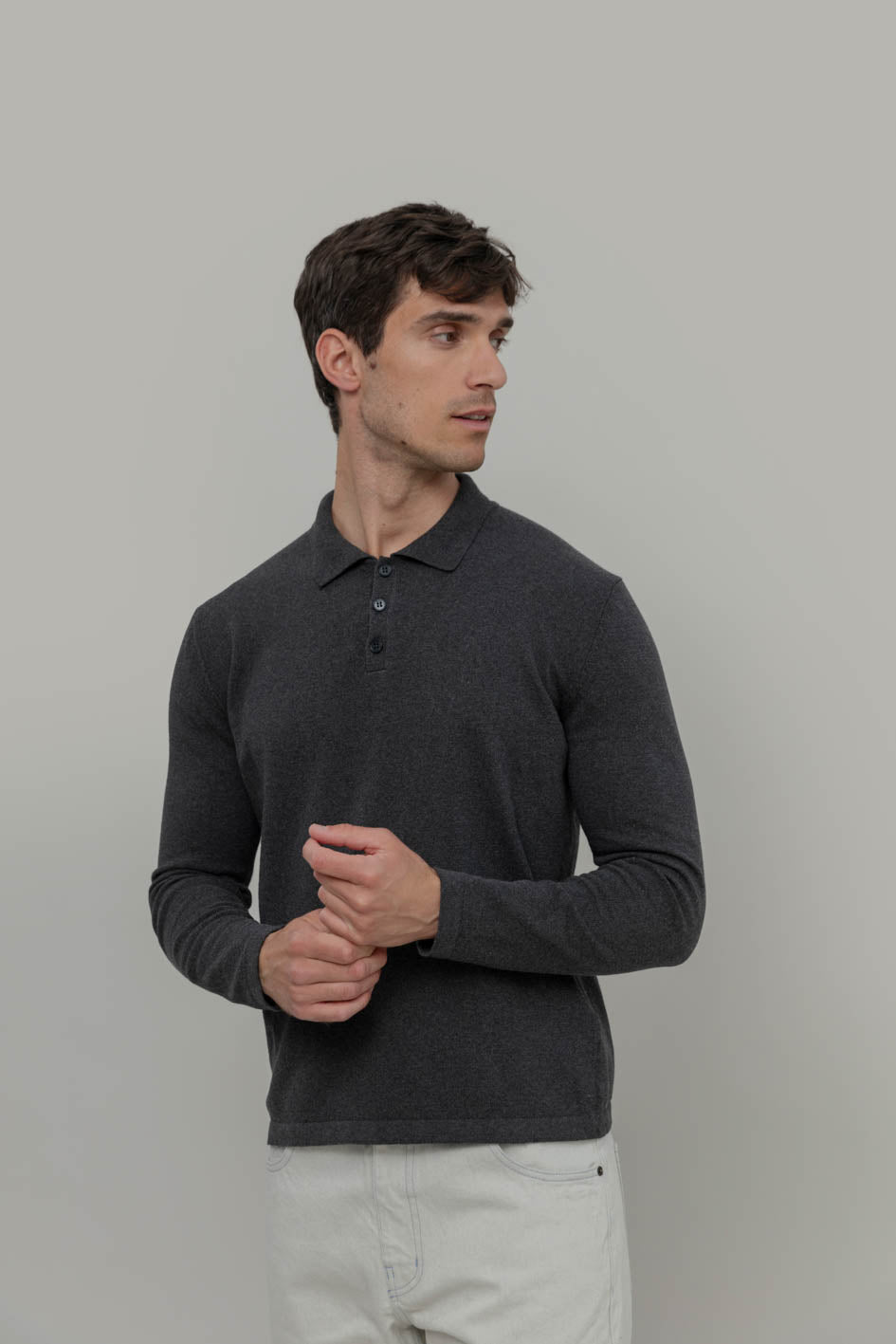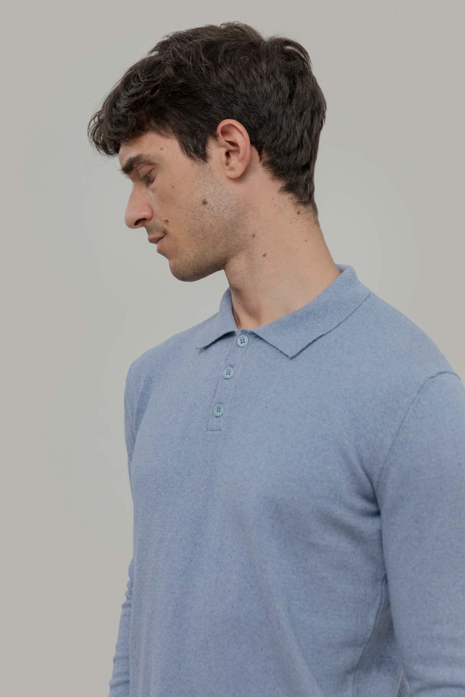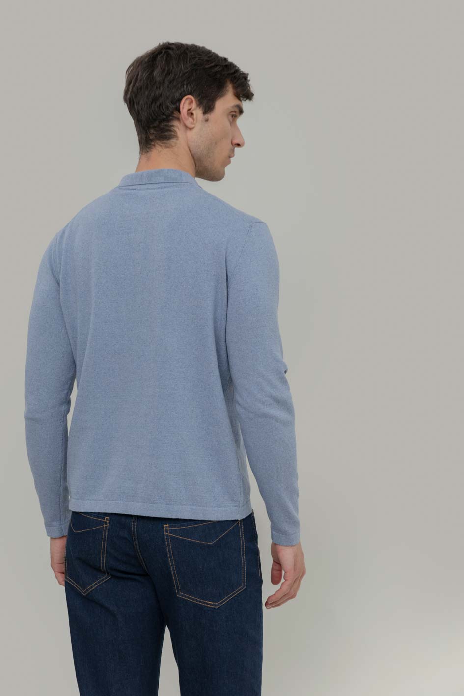 Antonio ist ein Herren-Poloshirt mit langen Ärmeln und Knöpfen, hergestellt aus einem nachhaltigen Garn aus 50% recylter Baumwolle und 50% Bio-Baumwolle.