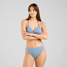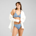 Mittelhoch geschnittene Bikinihose mit einem glatten, klaren Look. Sie sitzt an der Hüfte, hat einen leicht höheren Beinausschnitt für eine definierte Silhouette und bietet mittlere Bedeckung hinten. In Majolica Blue mit dünnen, vertikalen weißen Streifen; doppellagig und außen ohne sichtbare Nähte für ein sicheres Tragegefühl. Gefertigt aus recyceltem Polyester aus Plastikflaschen, der Stoff ist für seinen Recyclinganteil zertifiziert. Kombiniere sie mit dem passenden Streifen‑Top oder einem einfarbigen Bikini‑Top und ergänze ein luftiges Shirt – perfekt vom Strand ins Café.