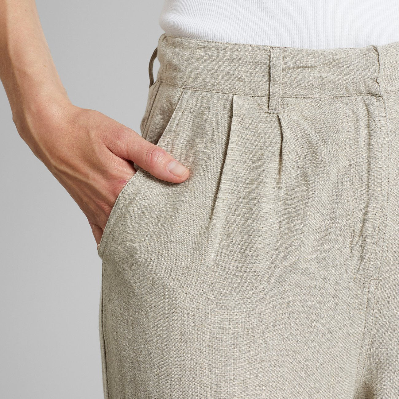Hochgeschnittene, locker sitzende Hose mit Haken- und Ösenverschluss in der Taille und zwei Bundfalten an jeder Seite. In voller Länge mit Gesäß- und Seitentaschen.