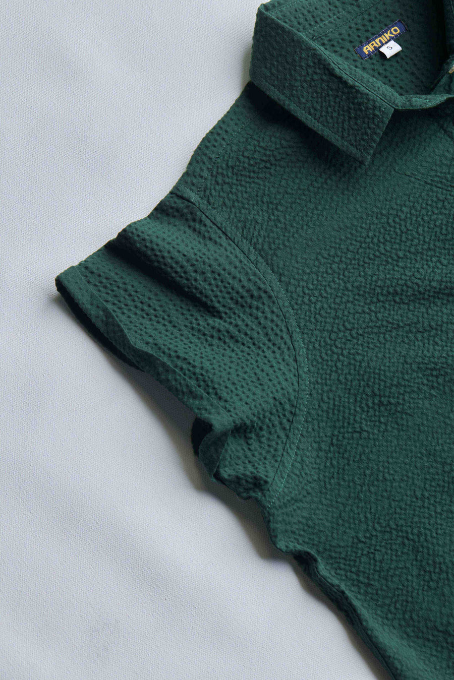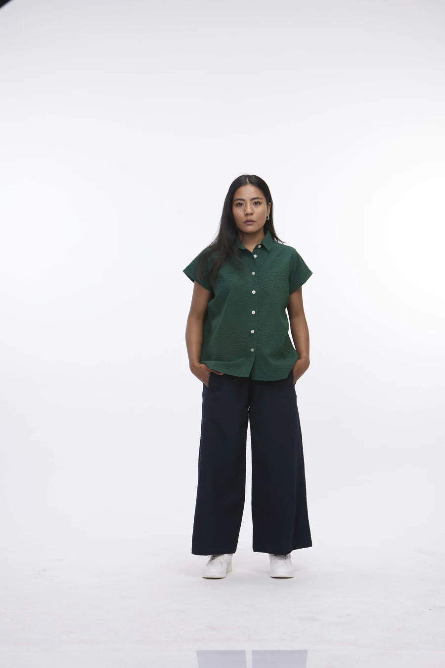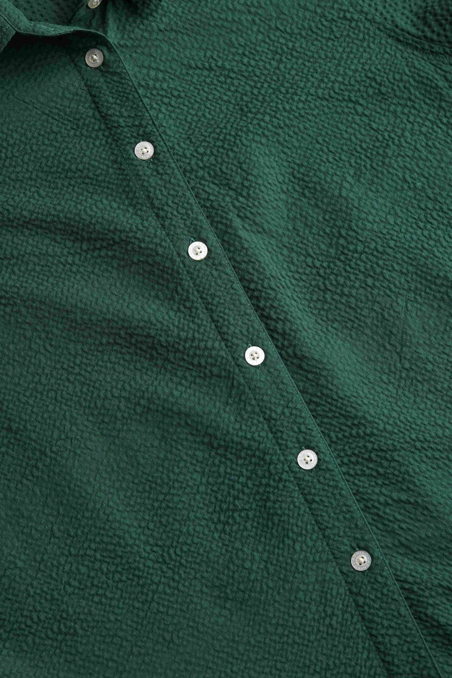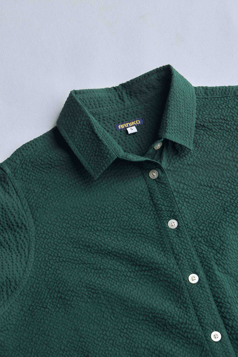 Das grüne Arniko Jo Hemd aus Seersucker. Es besteht aus 100 % Bio-Baumwoll-Seersucker, ist leicht, atmungsaktiv und auf Komfort ausgelegt. Die geraffte Textur hebt den Stoff von der Haut ab und sorgt so für eine bessere Luftzirkulation. Mit seinem klassischen Kragen und der durchgehenden Knopfleiste ist es ein vielseitiges Basic für warme Tage. Nachhaltig hergestellt in Kathmandu, Nepal.