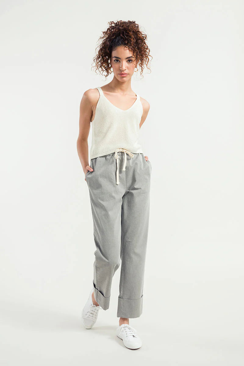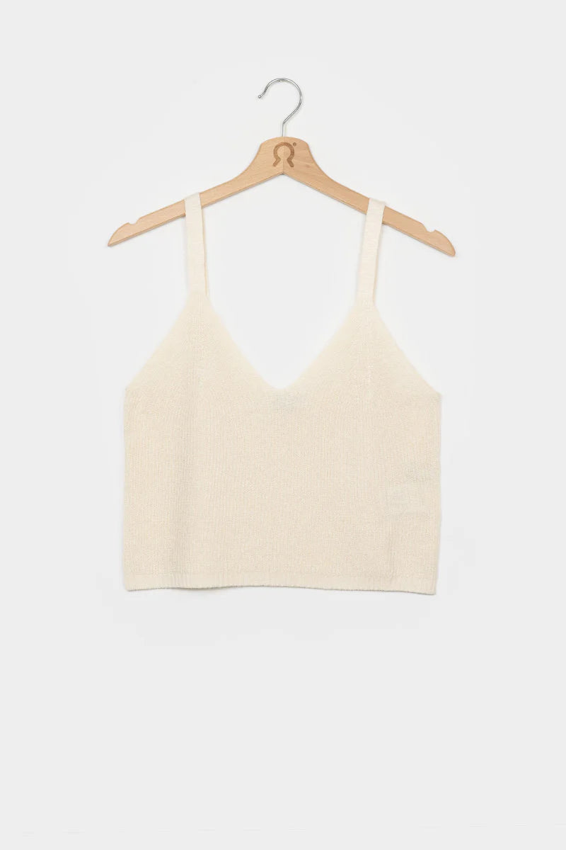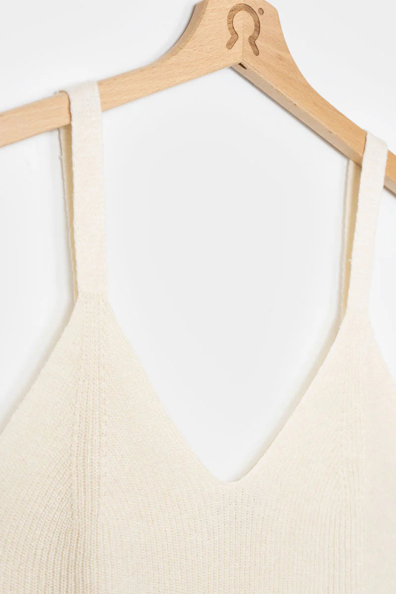 Das Crop Top für Damen besteht aus 100% recycelter Seide. Das Oberteil mit dünnen Trägern und V-Ausschnitt ist in hellem Naturweiß gehalten, um erneutes Einfärben zu vermeiden - damit wird Wasser und Energie gespart.