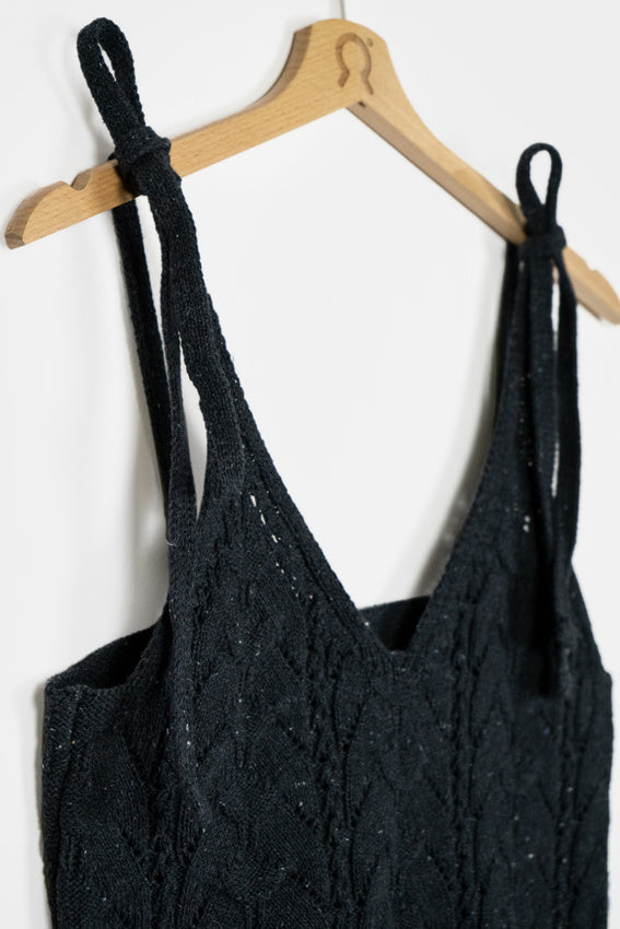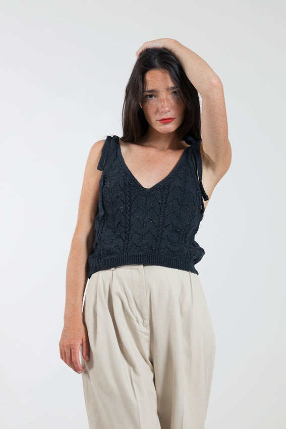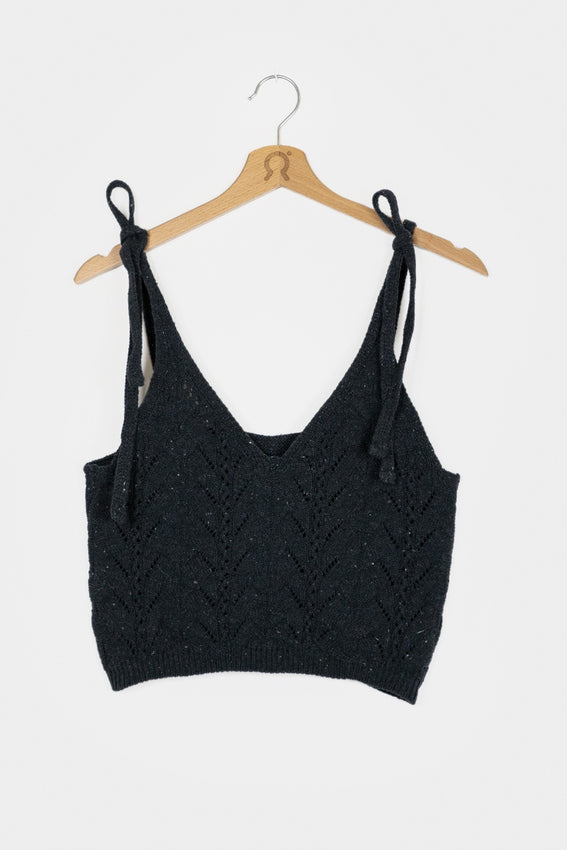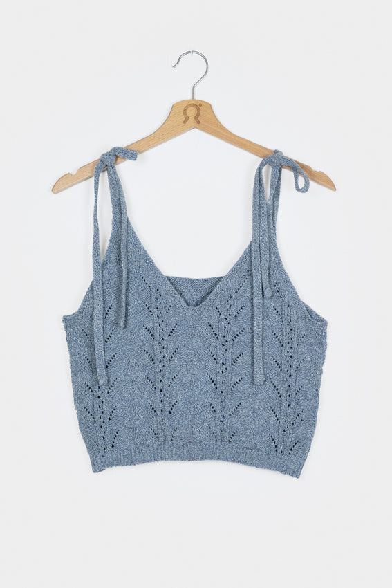 Das Stricktop René mit verstellbaren Trägern wird aus Garn hergestellt, das aus der Aufbereitung alter Jeans gewonnen wird. Dieses kurze Baumwolltop ist mit einem ganz besonderen Strickmuster gefertigt, das aussieht wie aus Omas Kleiderschrank, aber mit einem luftigen und modernen Design.