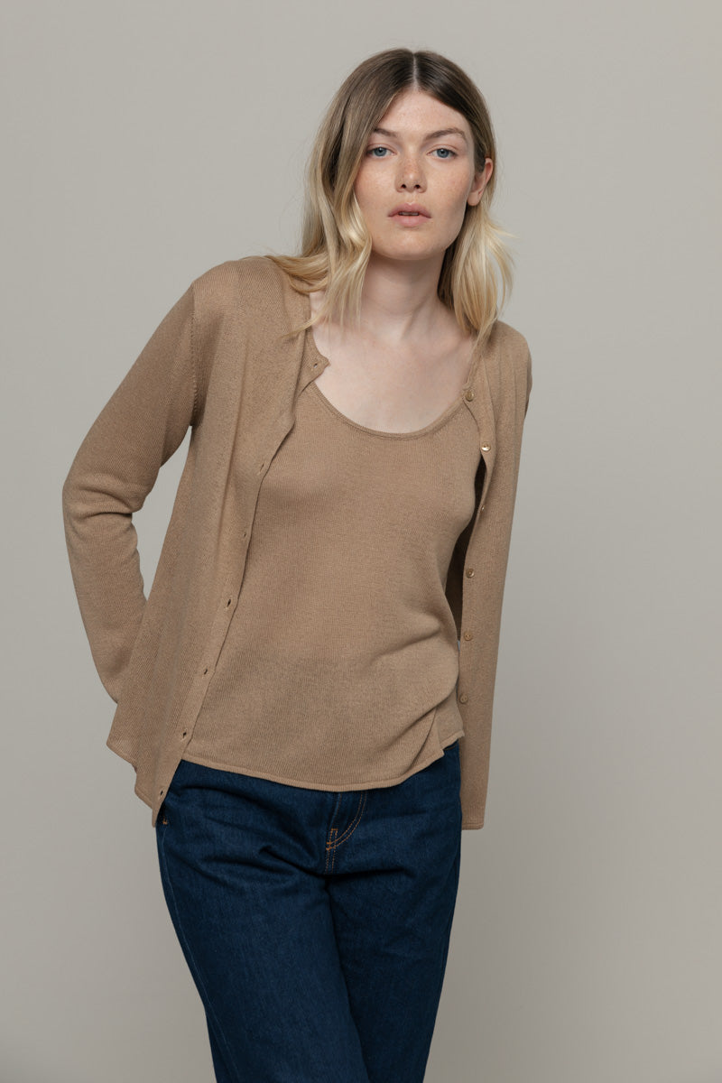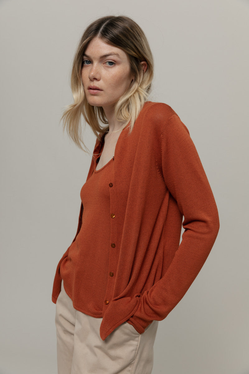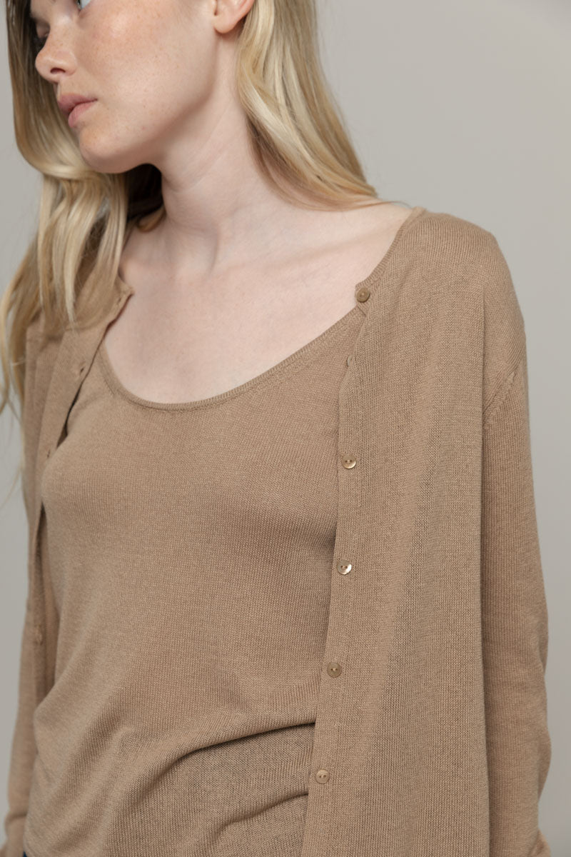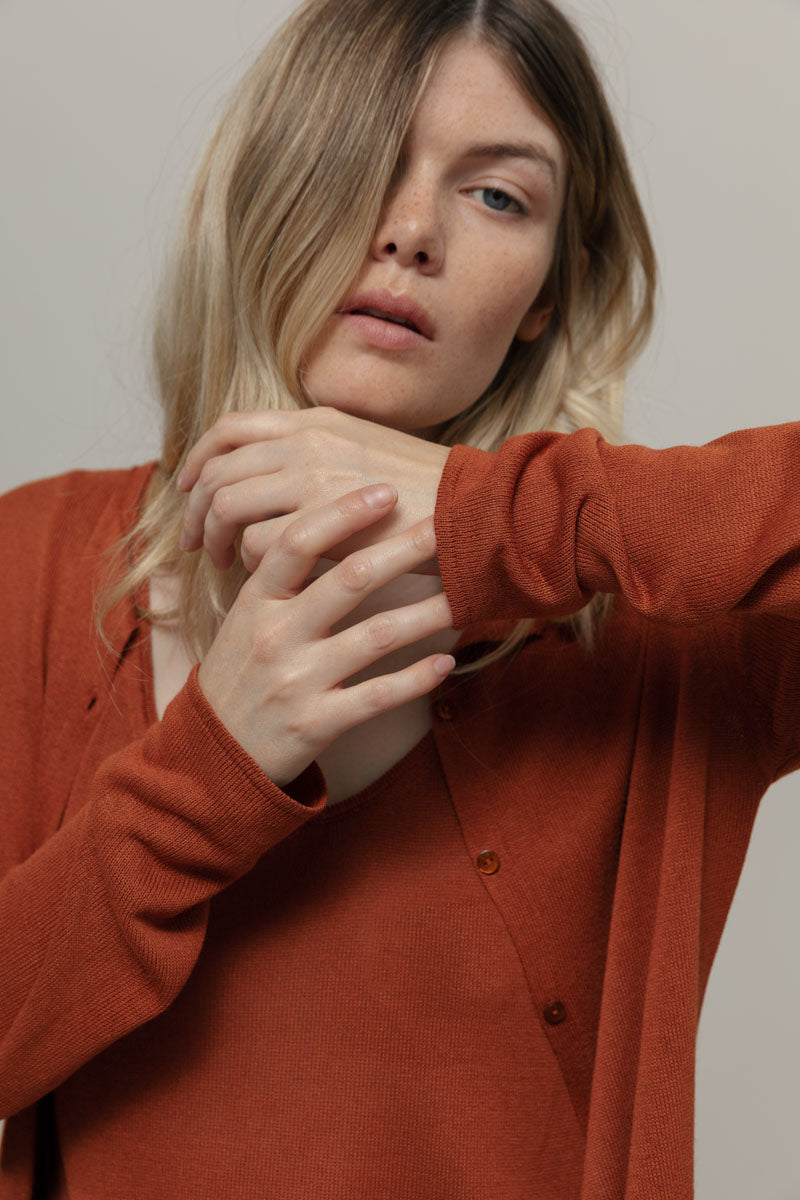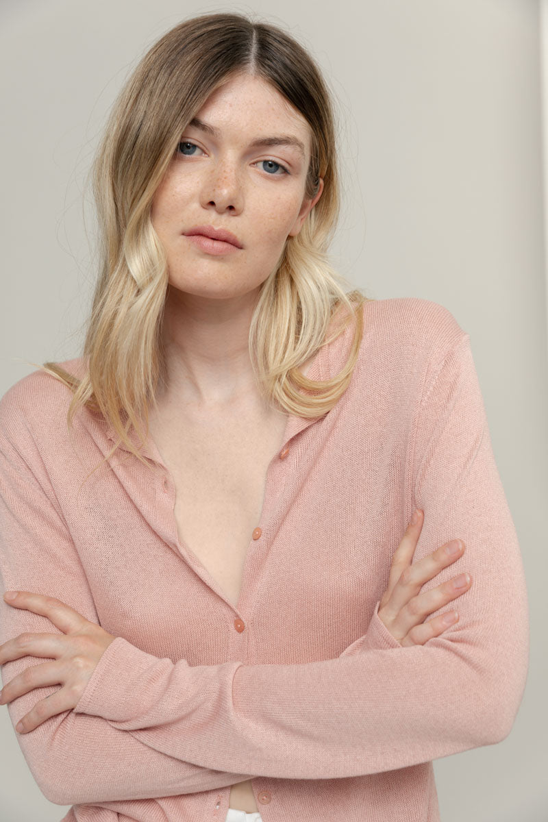 Vanessa ist ein Rundhals Cardigan mit Knöpfen und langen Ärmeln, sehr leicht und perfekt für den Sommer. Sie ist aus 100% Viskosegarn gefertigt, von dem ein Teil aus recyceltem Industrieabfall stammt.