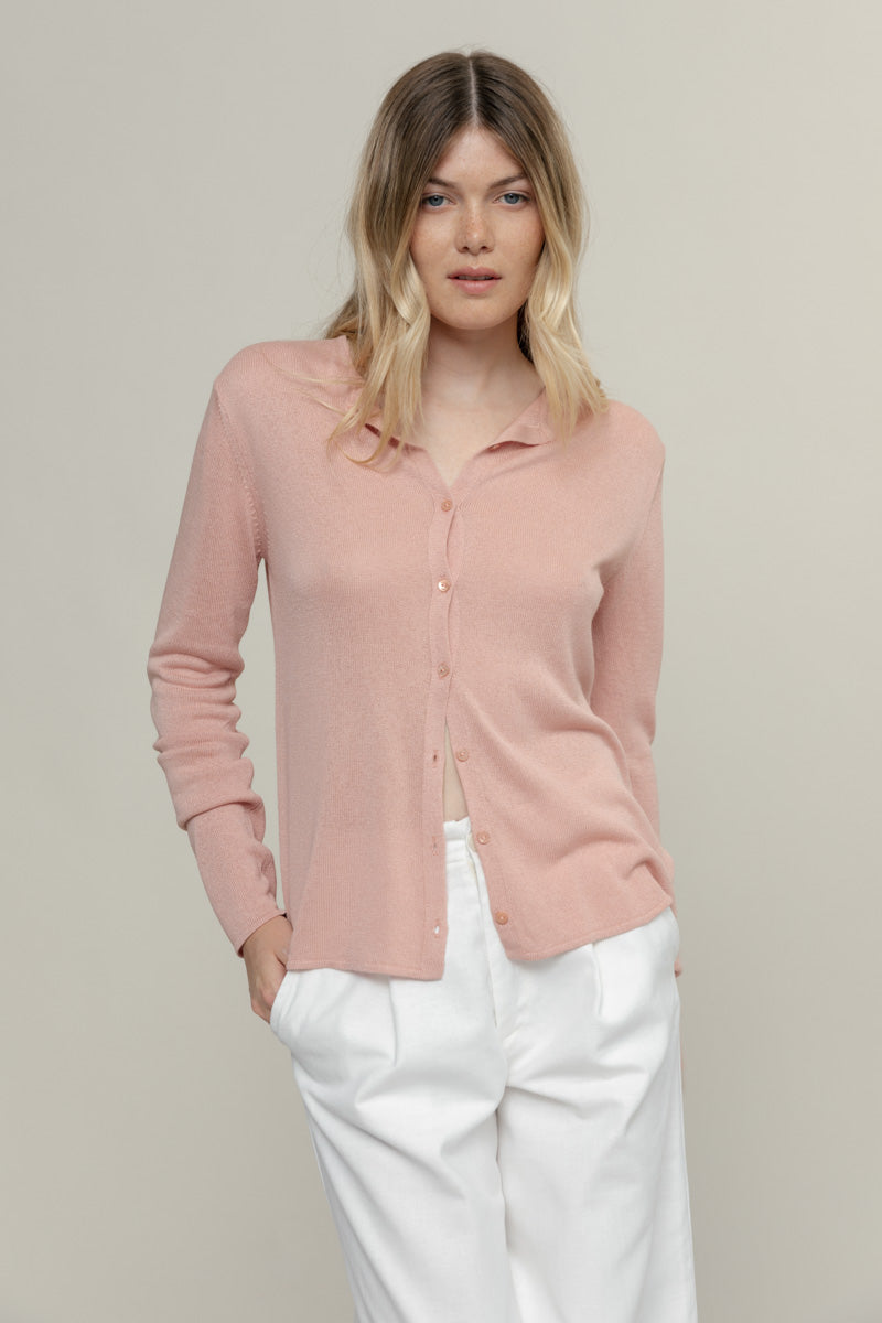 Ein Cardigan, der dank des feinen Garns weich fällt und mit seinem halbglänzenden Aussehen einen leichten Transparenteffekt erzeugt.