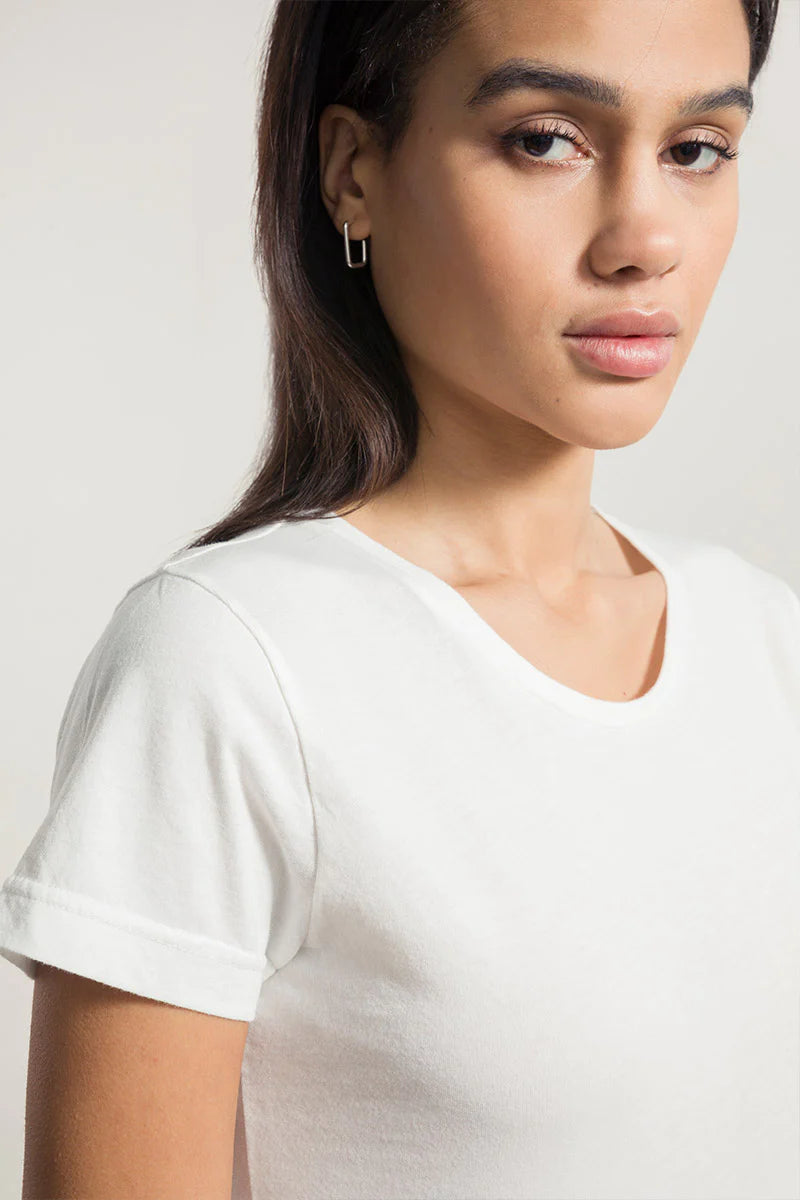 Das Franca-T-Shirt ist ein luftiges und nachhaltiges Kleidungsstück mit normaler Passform, das aus 100% Baumwolle besteht, halb aus Bio-Baumwolle und halb aus recycelten Industrieabfälle