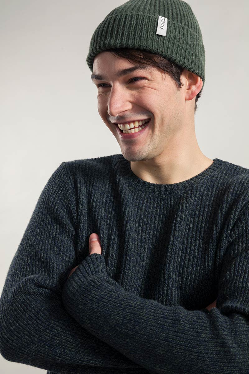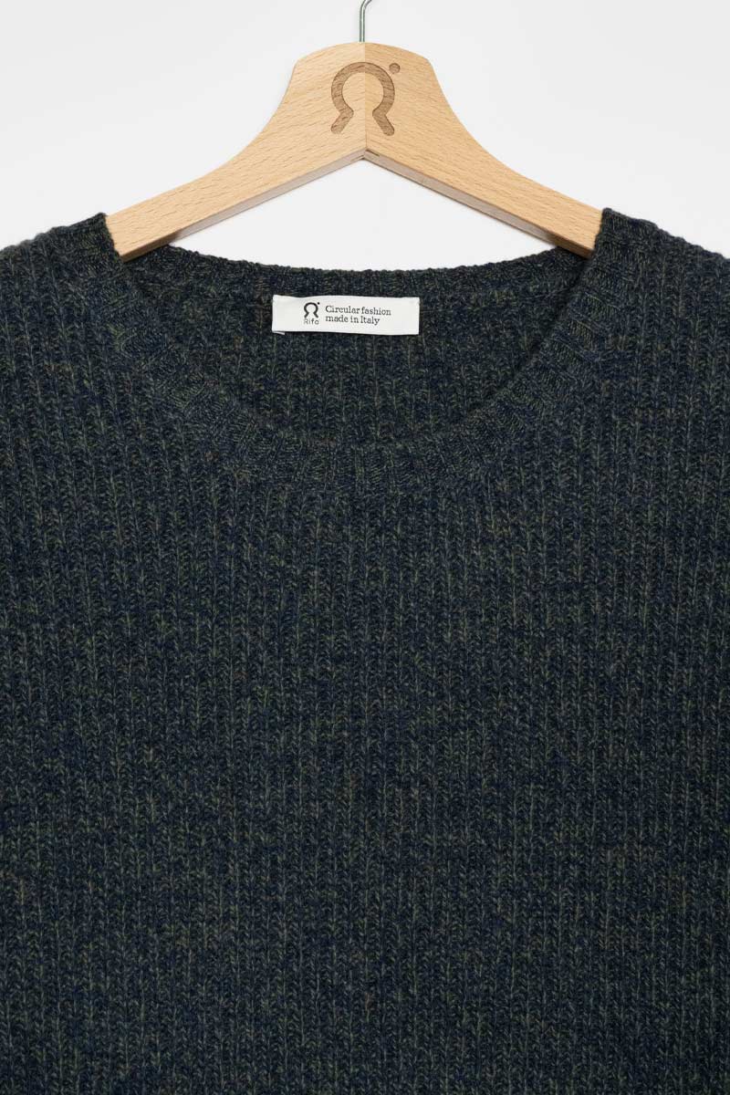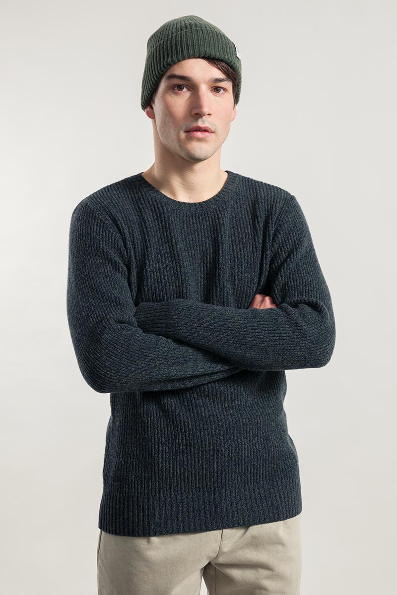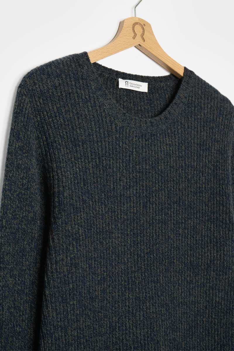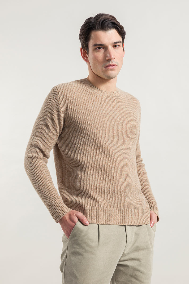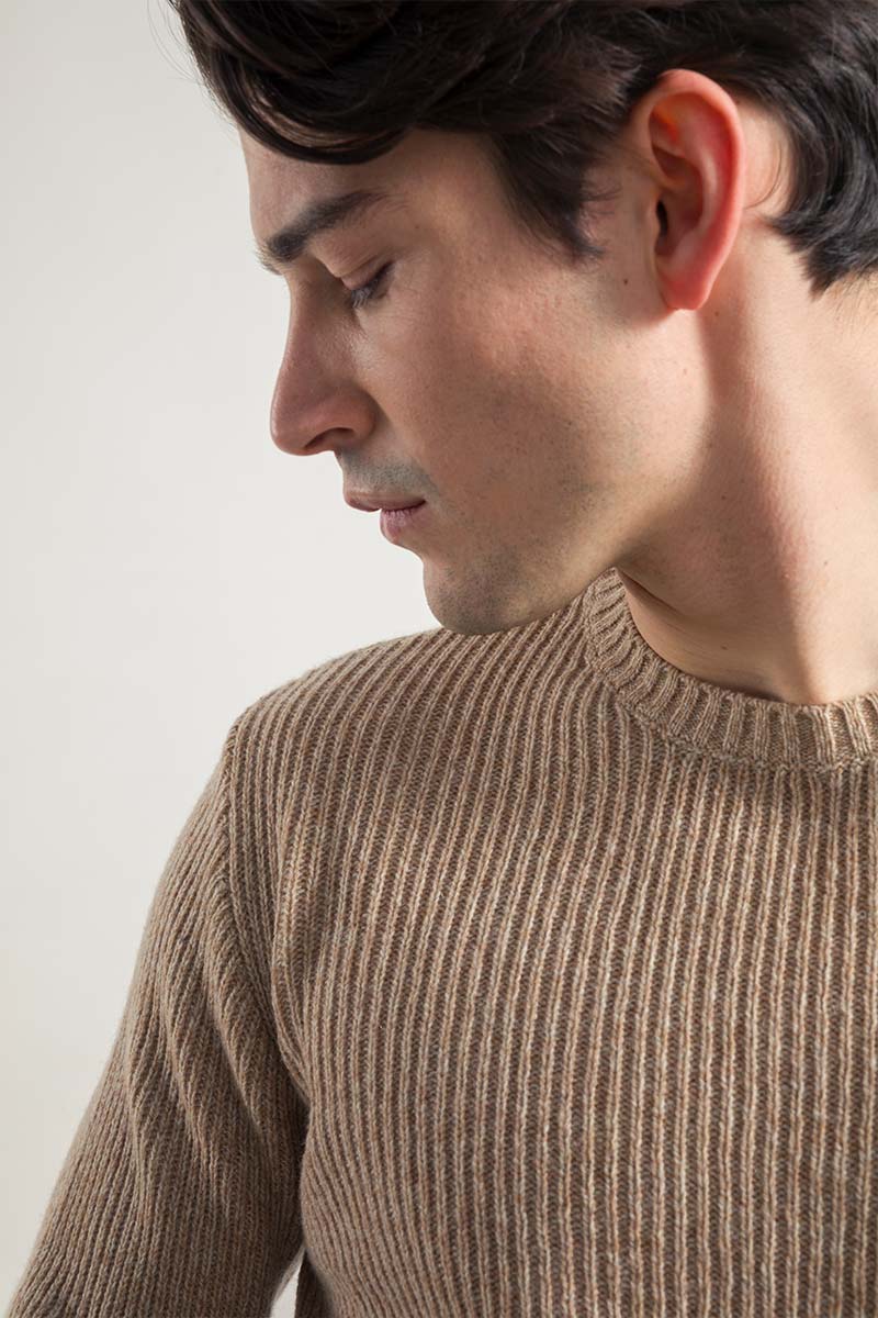 Der Pullover Carlo aus recyceltem Kaschmir hat einen gerippten Rundhalsausschnitt und ein Gewicht von 300 g. Sein Rippenmuster macht es einzigartig und verleiht ihm ein dreidimensionales Aussehen.