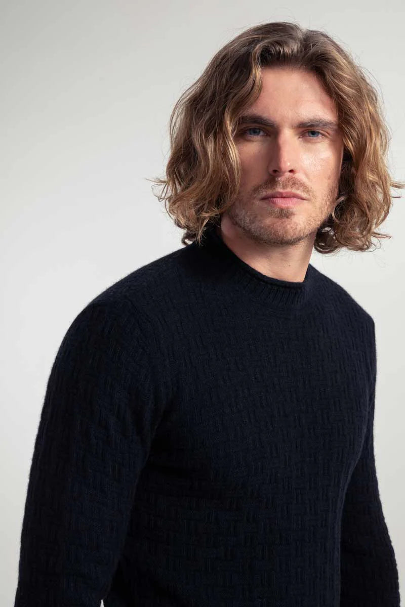 Fernando ist ein Herrenpullover mit Rundhalsausschnitt, hergestellt aus feinstem, recyceltem Kaschmir, natürlich und nachhaltig, für ein warmes und weiches Gefühl auf der Haut.