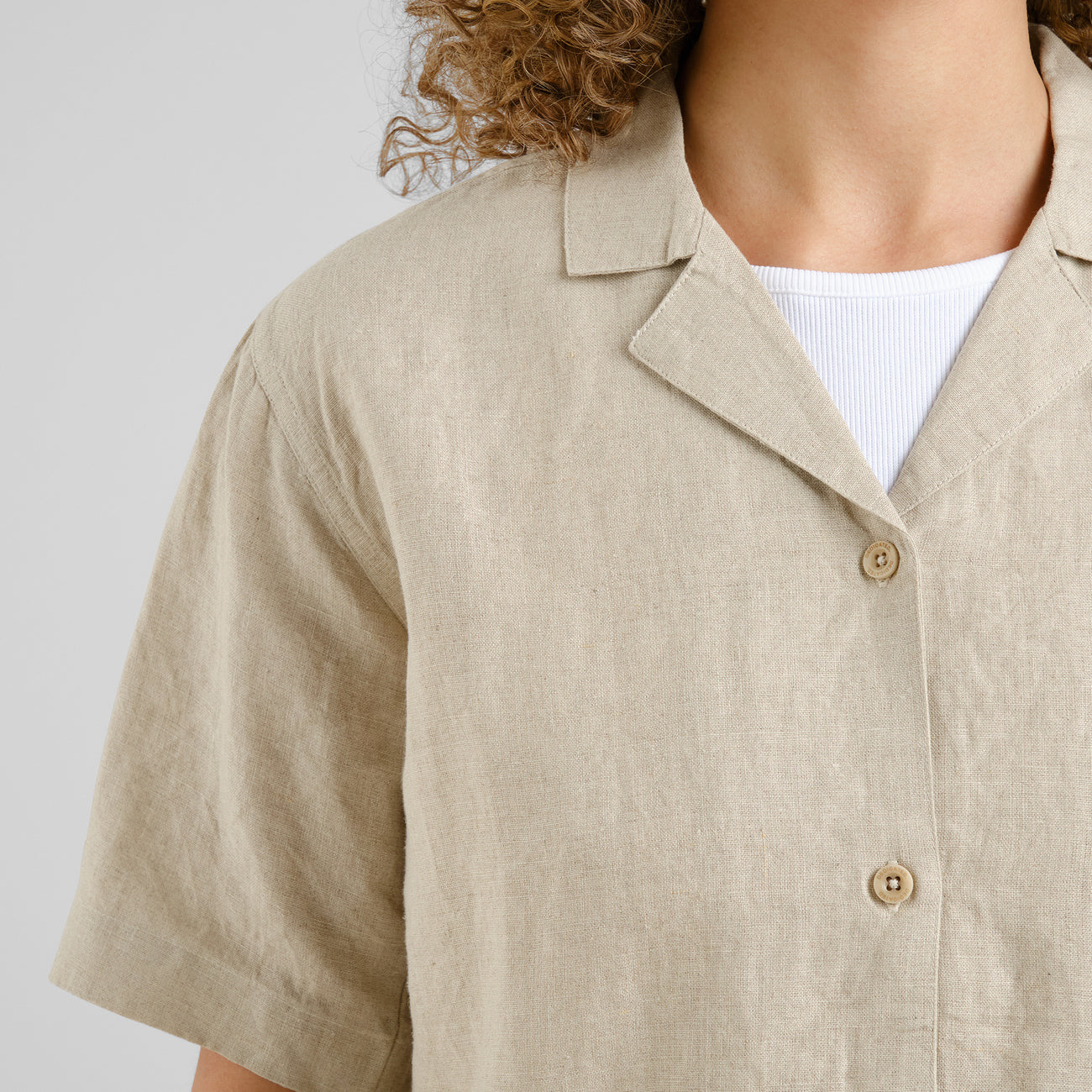 Lässig geschnittenes Damen-Leinenhemd mit kurzen Ärmeln, Resortkragen und abgerundetem Saum. Das perfekte Kurzarmhemd für den Sommer.