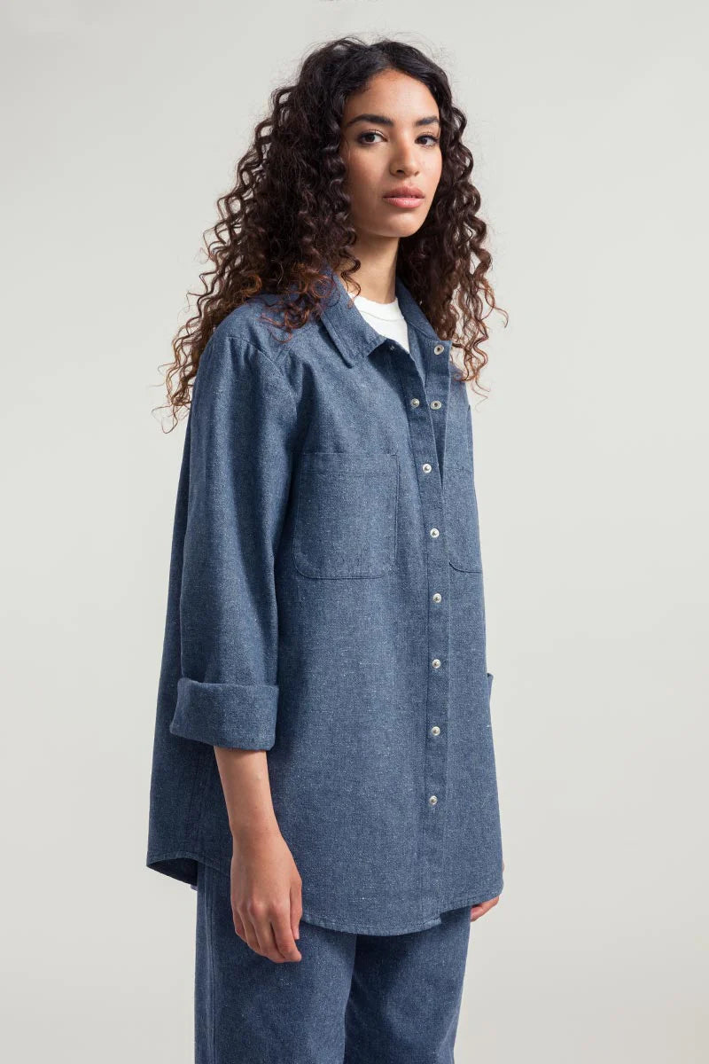 Das Unisex-Overshirt Jo ist eine grosszügige Hemdjacke aus einem robusten Stoff aus alten Jeans. Sie wurden hergestellt, recycelt und in ein neues Garn verwandelt. Dank des neuen, nachhaltigen und umweltfreundlichen Denim-Stoffes, den wir entwickelt haben, kann das Jo-Shirt auch als leichte Oberbekleidung getragen werden. Ein Basic-Kleidungsstück, das in Deinem Kleiderschrank nicht fehlen darf.